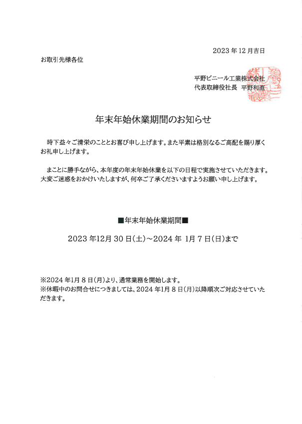 本年度の年末年始休業期間を2023年12月30日(土)~2024年1月7日(日)まで実施させて頂きます。