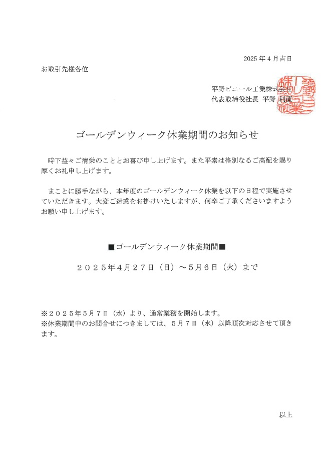 『2025年度 ゴールデンウイーク休業期間のお知らせ』 2025.04.15 お知らせ 本年度のゴールデンウイーク休業期間を2025年4月27日(日)~2025年5月6日(火)まで実施させて頂きます。大変ご迷惑をおかけいたしますが、何卒ご了承くださいますようお願い申し上げます。