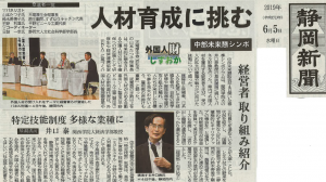 6月5日付の静岡新聞「外国人財しずおか」の記事に、シンポジウムで登壇した平野ビニール工業(株)代表取締役社長 平野利直が掲載されました。