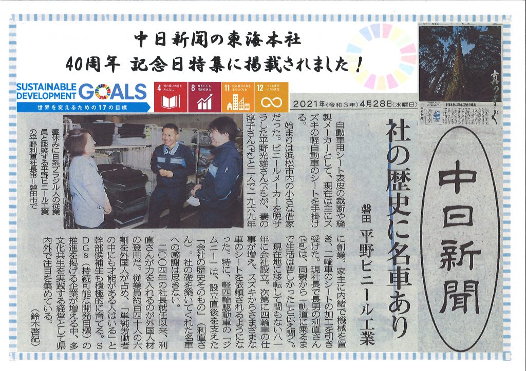 2021年4月28日中日新聞の東海本社40周年 記念日特集に掲載されました。