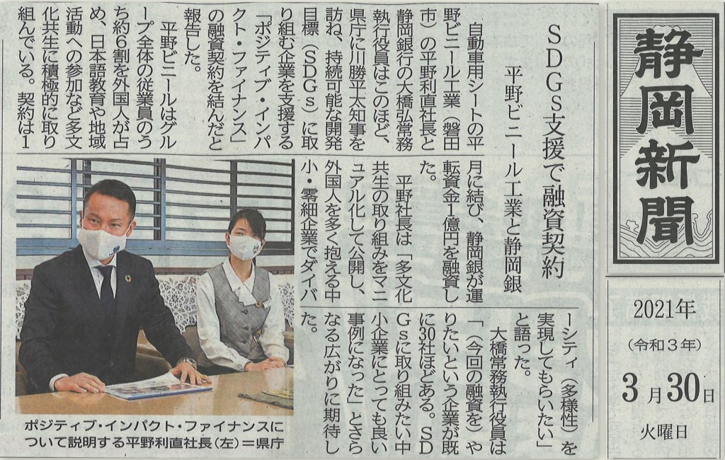 Ngày 26/3/2021, chúng tôi cùng với Ngân hàng Shizuoka Bank và Phòng nghiên cứu kinh tế Shizuoka đã đến thăm văn phòng thống đốc tỉnh Shizuoka Kawakatsu Heita để báo cáo về “Positive Impact Finance” (Tạm dịch: Gói tài chính cho những ảnh hưởng tích cực) dành cho doanh nghiệp vừa và nhỏ đầu tiên tại Nhật Bản.