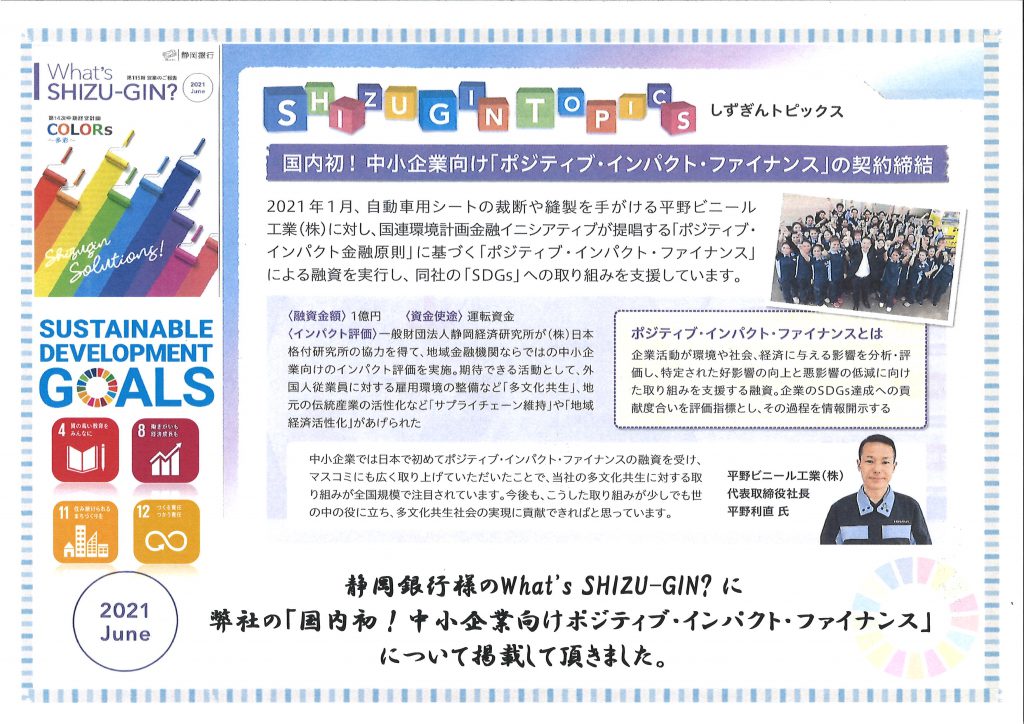 静岡銀行様発行の「What’s SHIZU-GIN?6月号」で、ポジティブ・インパクト・ファイナンスの契約締結について掲載していただきました。